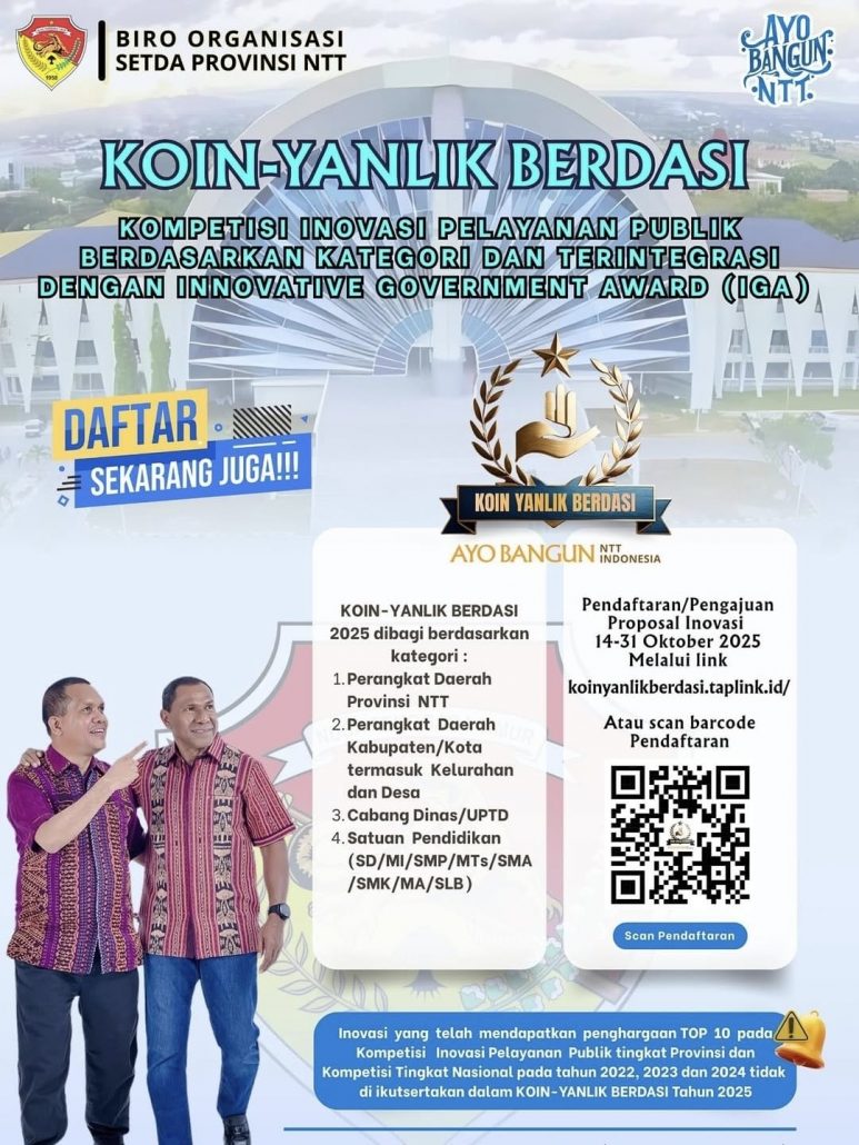 Kompetisi Inovasi Pelayanan Publik di NTT merupakan ajang tahunan untuk mendorong inovasi dalam pelayanan publik di tingkat provinsi dan kabupaten/kota. Pemerintah Provinsi NTT melalui Biro Organisasi Setda Provinsi NTT memfasilitasi kompetisi ini untuk menjaring inovasi yang dapat meningkatkan kualitas pelayanan publik bagi masyarakat. Kompetisi Inovasi Pelayanan Publik kini hadir kembali di tahun 2025 dengan mengusung nama baru yaitu KOIN YANLIK BERDASI : Kompetisi Inovasi Pelayanan Publik Berdasarkan Kategori dan Terintegrasi dengan Innovative Government Award (IGA).